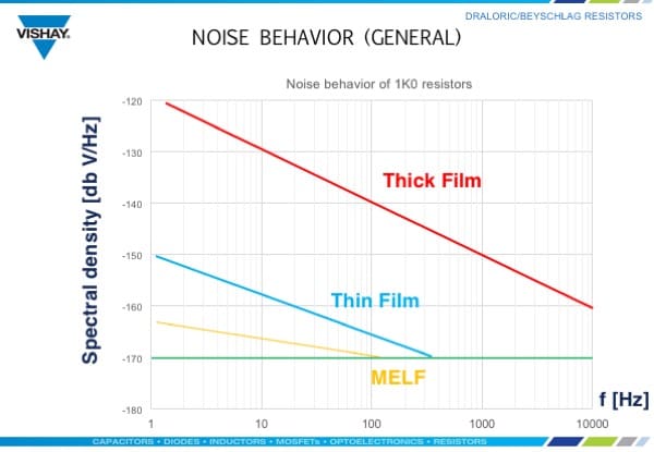 Then, I heard about metal electrode leadless face (MELF) resistors produced by Vishay Intertechnology (http://www.mouser.com/new/vishay/vishay-melf/). High-end audiophiles always want to experience the playback exactly as recorded without any distortion. They are willing to go to great lengths and expense to ensure that their audio components are of the highest grade. MELF resistors can help in these high-end applications because they provide unique characteristics that are not found within the most common carbon, thin-film, and thick-film resistor arrangements. High-end audiophiles want their analog-to-digital converters (ADC) and digital-to-analog converters (DAC) and amplifiers to exhibit the lowest noise possible and be ultra-stable. MELFs delight audiophiles because they deliver low noise performance, uniform component design, excellent stability and precision, and best of all, they provide nearly ideal resistor performance – introducing essentially no discernable signal distortion to pass through. Compared to thick film resistors, MELFs typically offer an improvement in spectral density on the order of -40dBV/Hz and relative to thin-film resistors roughly -10dBV/Hz.