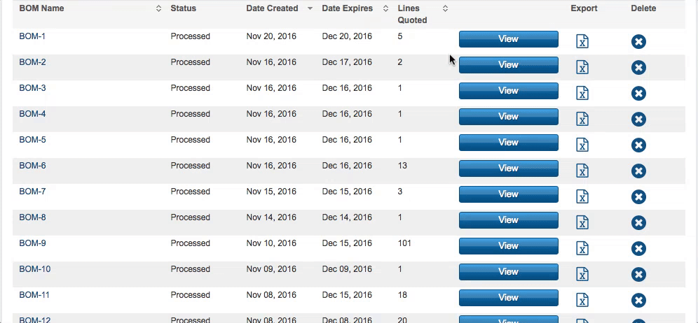Después de 30 días, el precio cotizado para su BOM caducará y deberá actualizarse. Seleccione el botón "Actualizar" para cualquier BOM vencida a fin de volver a procesar los datos y cotizar un precio nuevo.